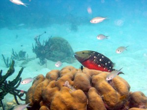 Le site de la Grande Caye est délimité au nord par une longue barrière de corail qui émerge un peu à marée basse. C’est là que se réfugient de nombreux poissons côtiers.