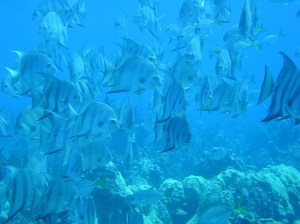 C’est une plongée de pleine eau. Stabilisé à 18 mètres dans un banc de platax, le plongeur aura une vu plongeante sur les énormes patates de corail jusqu’au bord du tombant qui commence dans les 30 mètres. Lorsque vous y serez, vous comprendrez pourquoi il s’appelle le Jardin Vert. Le site est resté en jachère plusieurs années. Il a gardé tout son charme malgré le fait que les raies y soient plus rares. On y croise, entre autres, des grosses sardes souvent solitaires, des thazards curieux qui nous accompagnent pendant la plongée, des barracudas parfois immobiles, et très souvent les bancs de petits comme les maniocs, carangues juvéniles, coulirous, …. Oui, le palier en pleine eau, dans un banc de maniocs c’est encore mieux !