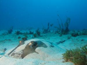 Lorsqu’on se rapproche un peu du fond, on y trouve des soles, crustacées et mollusques tels que le lambi. La rencontre d’une raie ou d’une tortue n’est pas rare, mais pas systématique. La diversité et le relief du site permettent souvent des plongées de très longue durée.