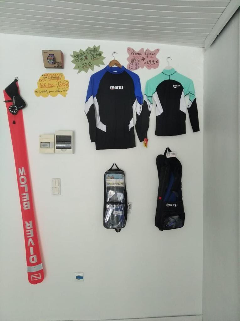 Sur place notre boutique permet en outre d’acheter du petit matériel : lycra, palmes, masque, tuba, parachute, ordinateur, …